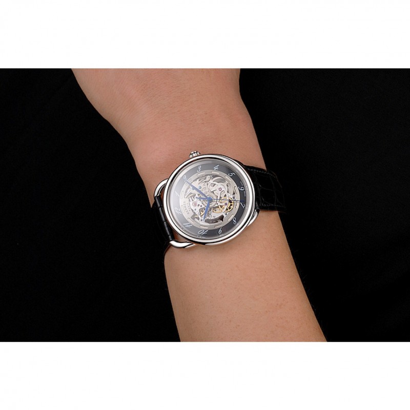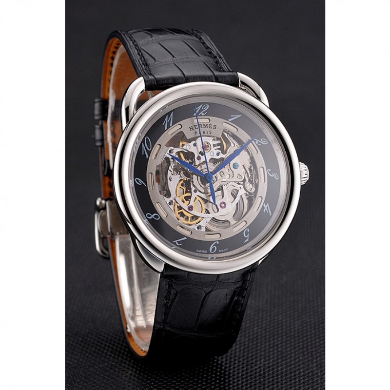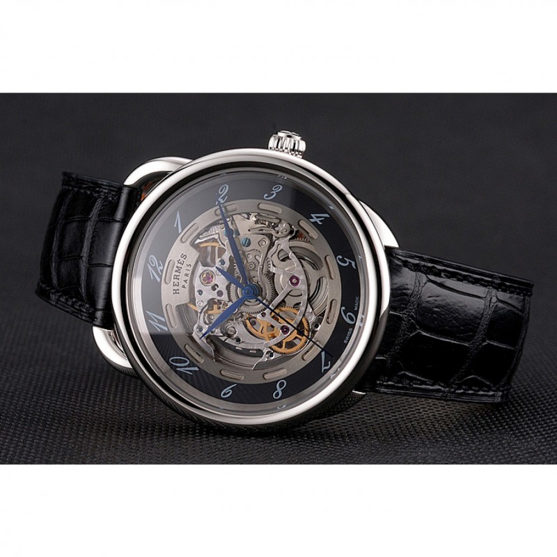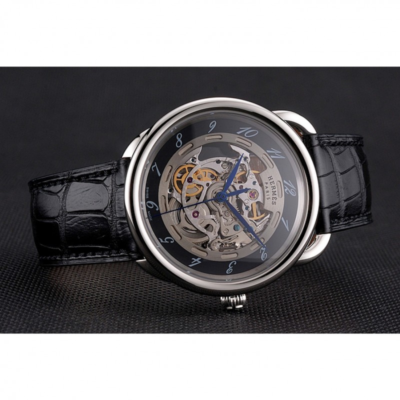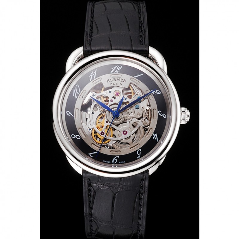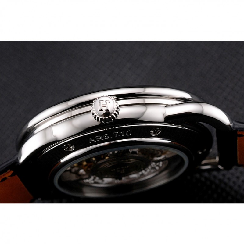Retourmécanique transparent révélant arrière en acier inoxydable poli vissé dans la jante et la gravure Hermes