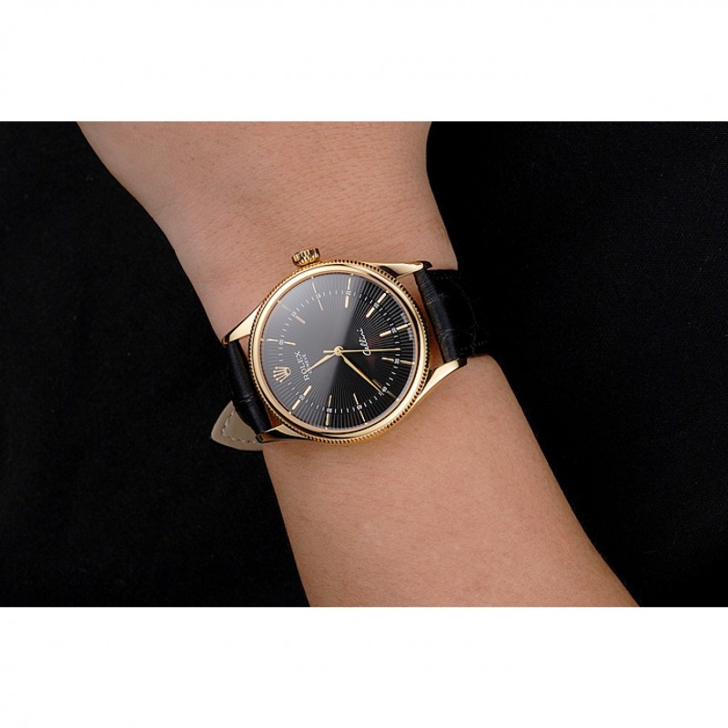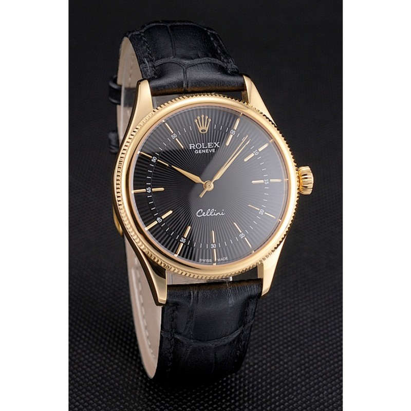 Swiss Rolex Cellini cadran noir or Marquages ​​boîtier en or Bracelet en cuir noir