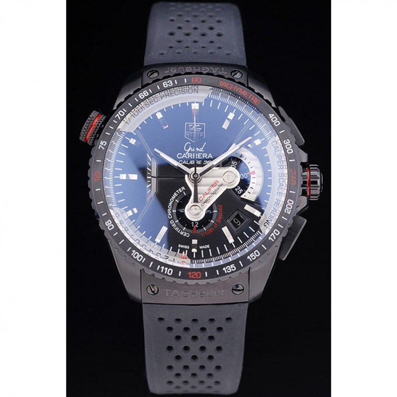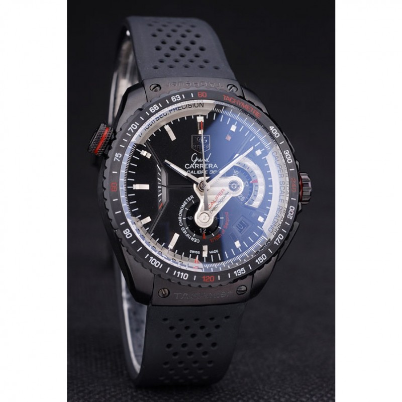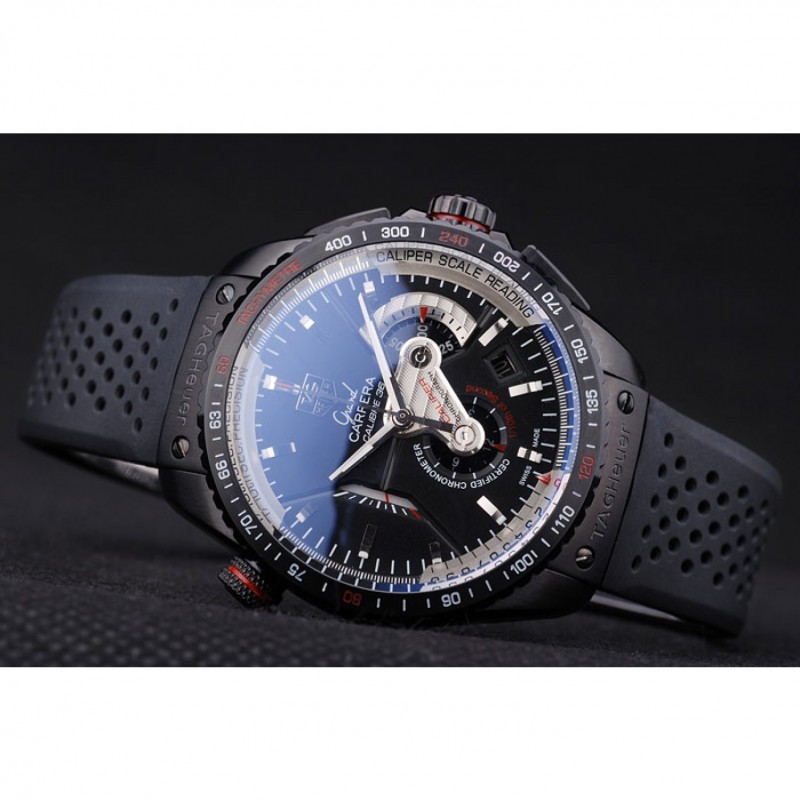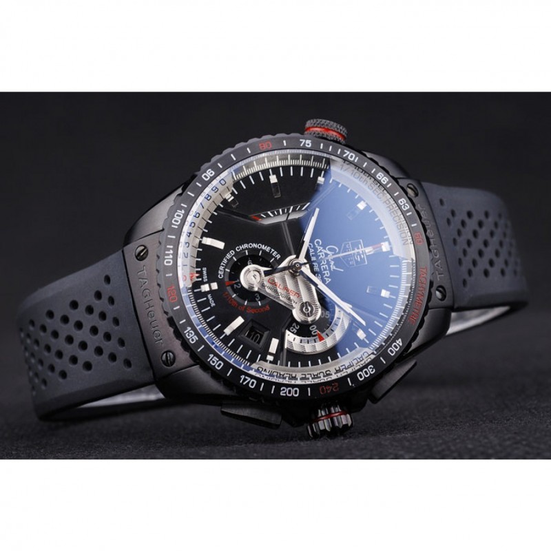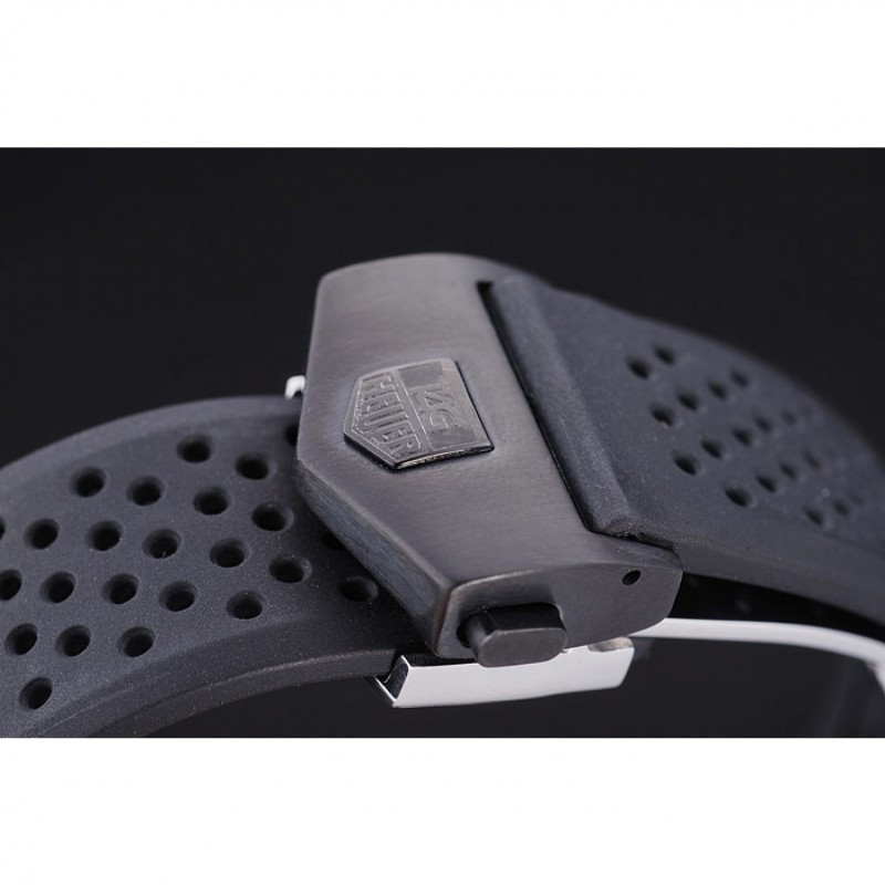 Bracelet:courroie perforée en caoutchouc noir avec Tag Heuer gravé bouton-poussoir ion-plaqué fermoir caché