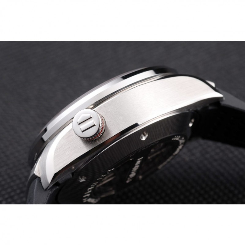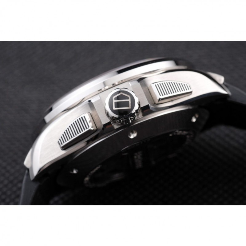 Couronne:couronne polie en acier inoxydable cutwork d’émail noir Tag Heuer logo et deux couronnes à boutons-poussoirs rectangulaires de chaque côté et une grande couronne dans le coin supérieur opposé avec le logo