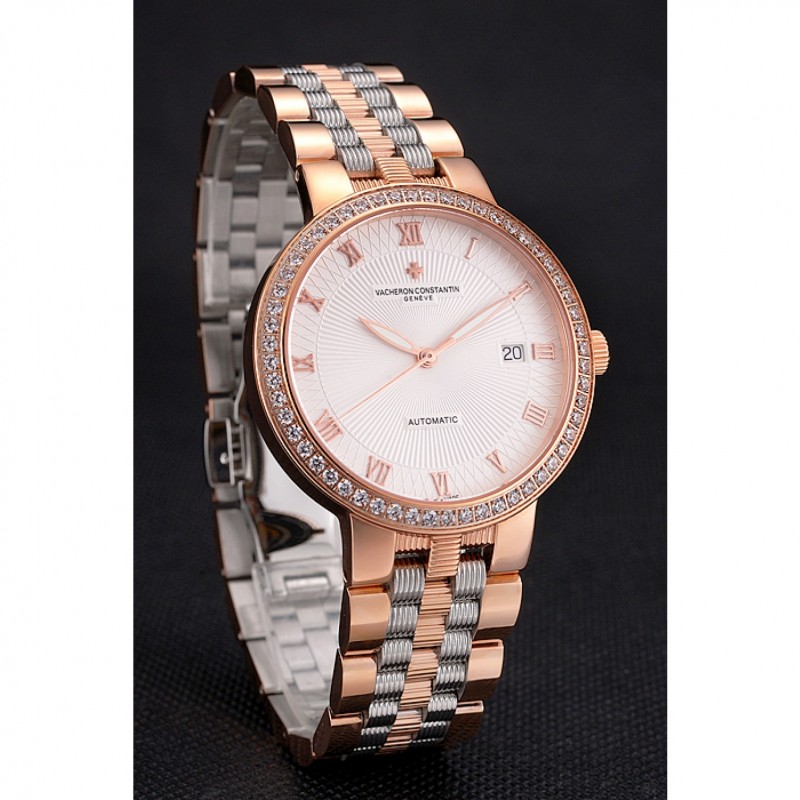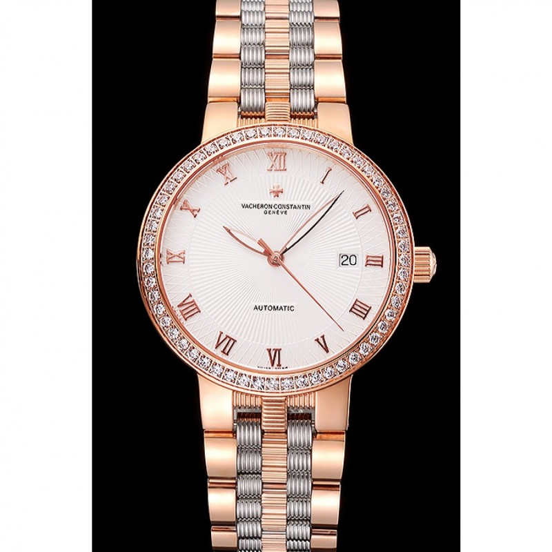 Suisse Vacheron Constantin Cadran Blanc Diamant Traditionnelle Lunette Or Rose Bracelet Deux Tone